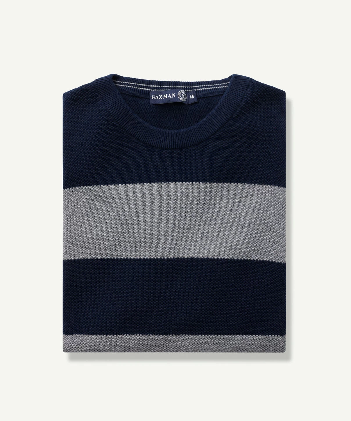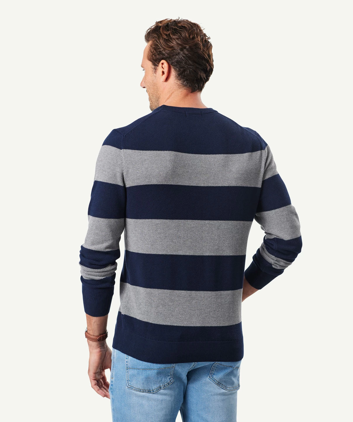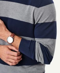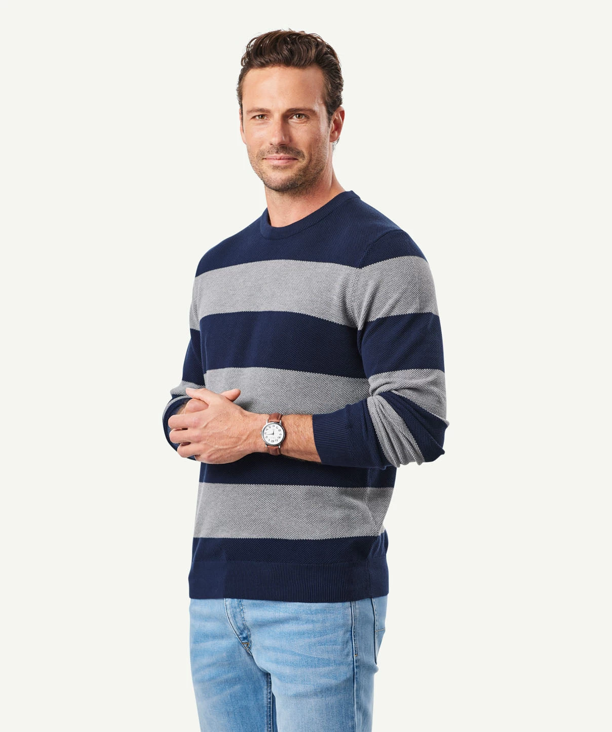 We are enjoying the classic sporty look of our new stripe crew knit. Made using a soft cotton knit this garment will be great at home or look smart at a casual office setting. Pair with a t-shirt and jeans and you have an easy casual weekend look.