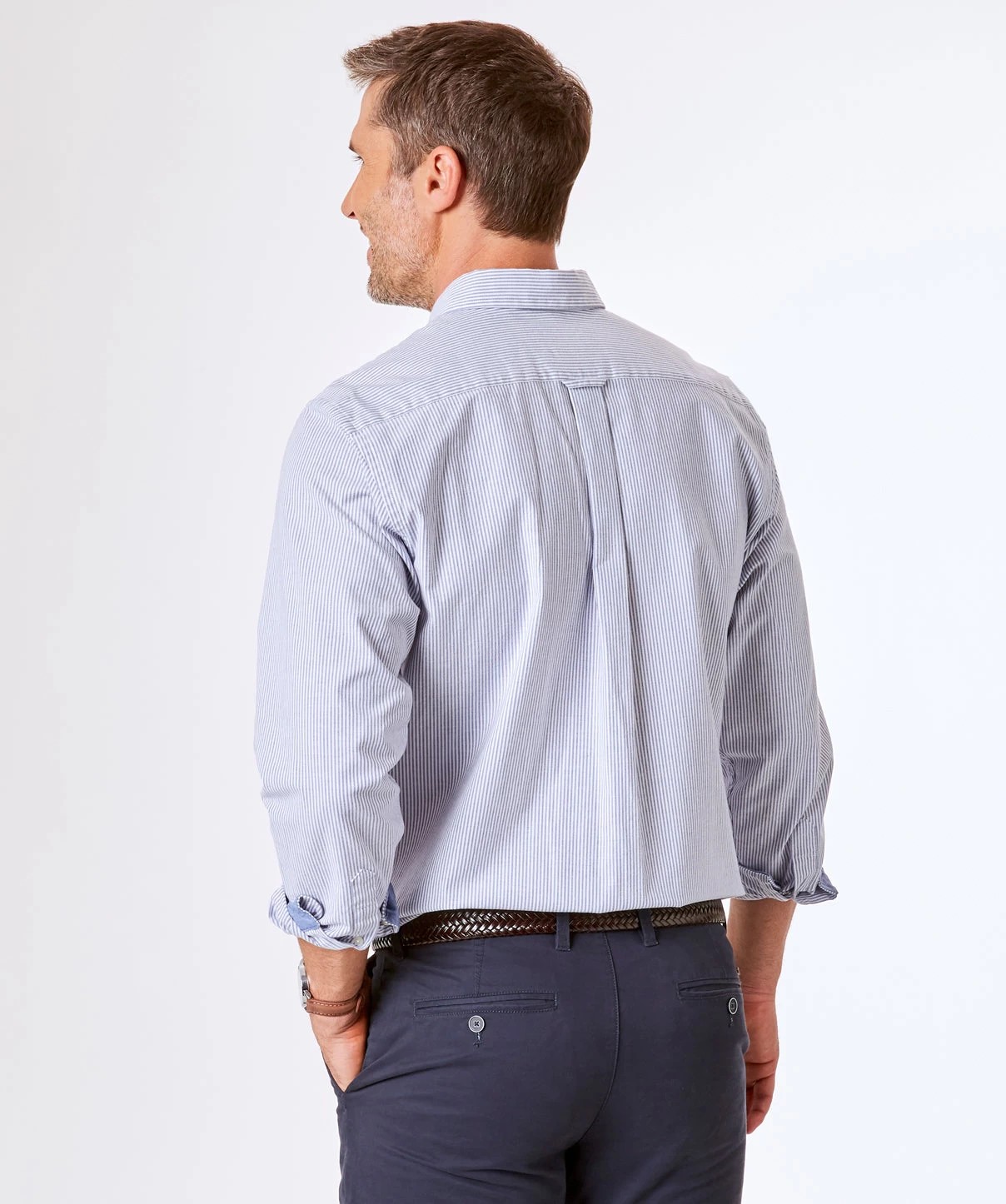 This striped oxford shirt will be on high rotation in your wardrobe once you feel the comfort of pure cotton fabric blended with a hint of stretch. Easy to pair with just about anything in your wardrobe, this blue and white oxford shirt is a wardrobe classic.