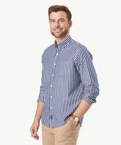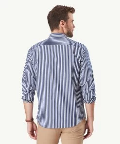 Cut in a regular fit and featuring a chest pocket and removable collar stays, this shirt can be easily styled with any wardrobe. Wear the Navy stripe with denim or a tan chino for easy style.
