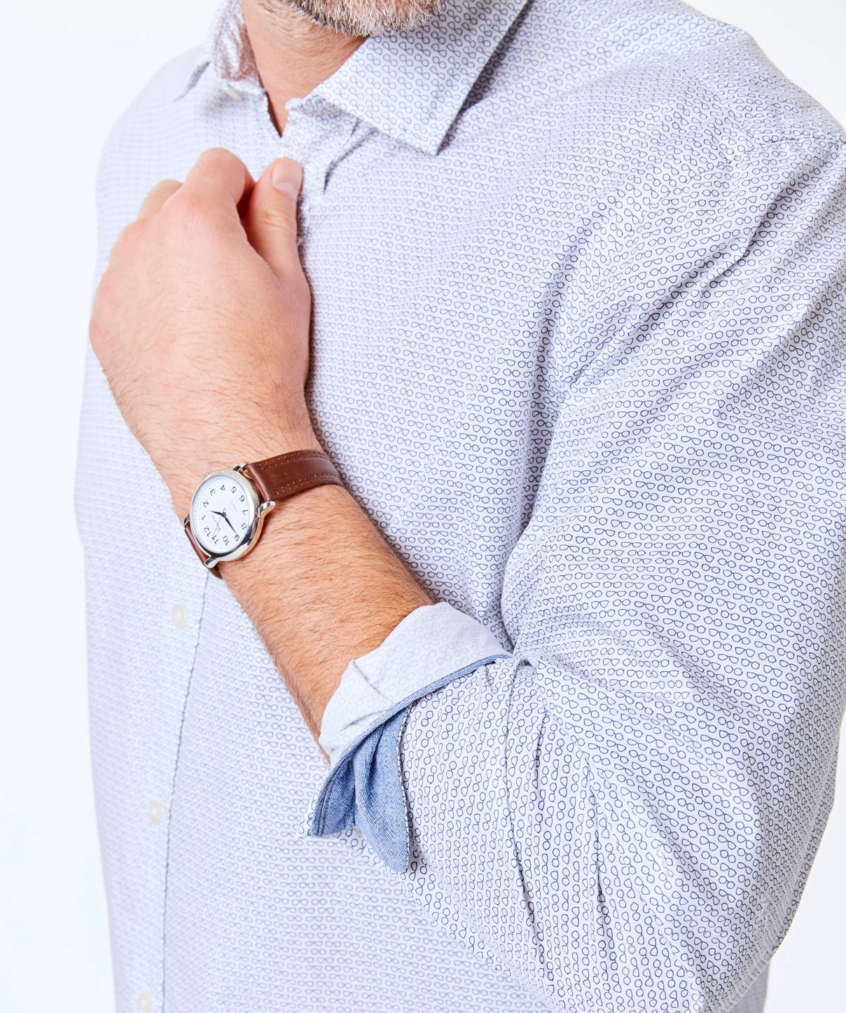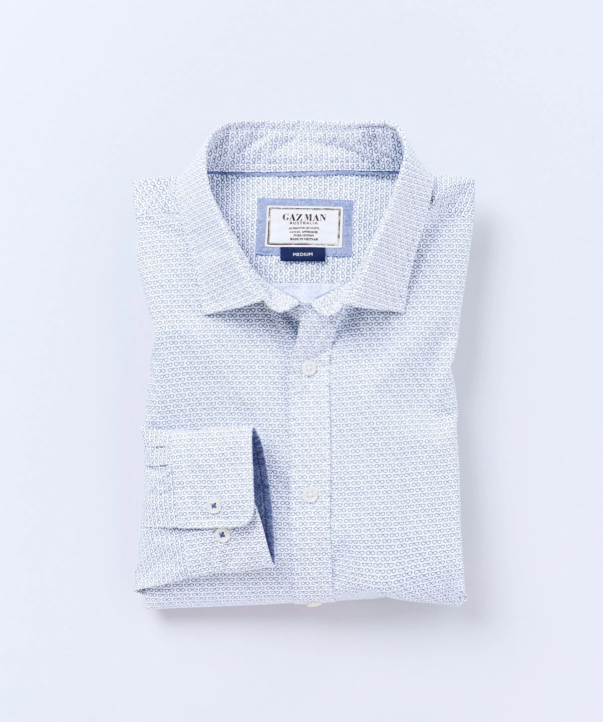 Add a touch of fun into your wardrobe with our sunglasses print shirt. Featuring a blue pattern on a white background, this men’s casual shirt looks smart with the sleeves rolled up.