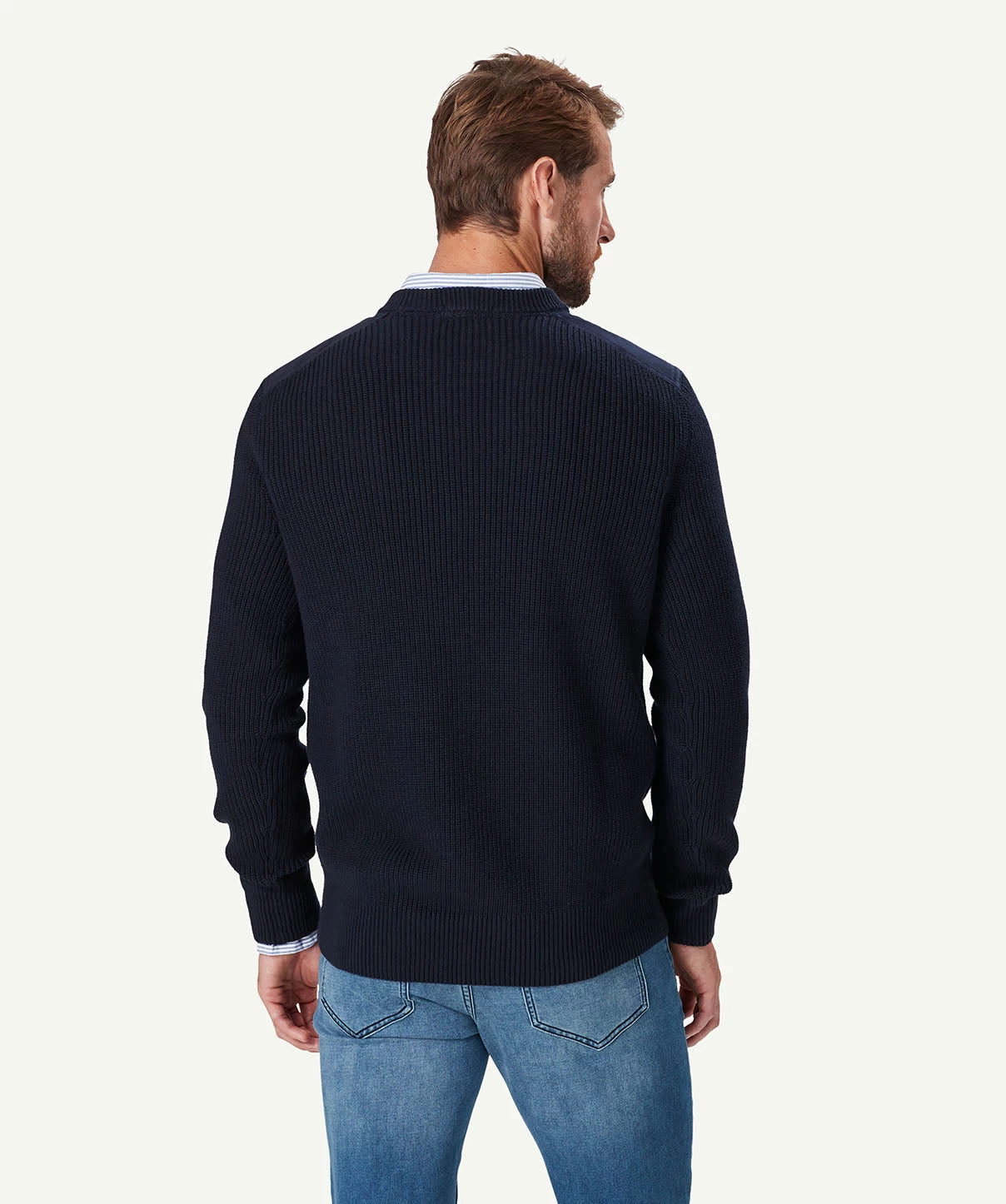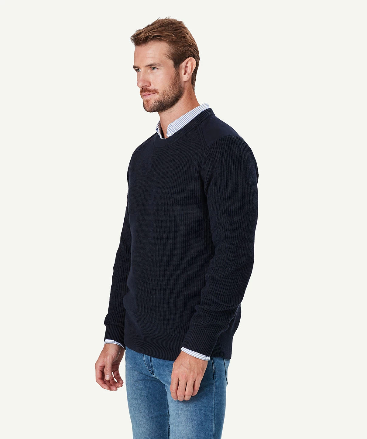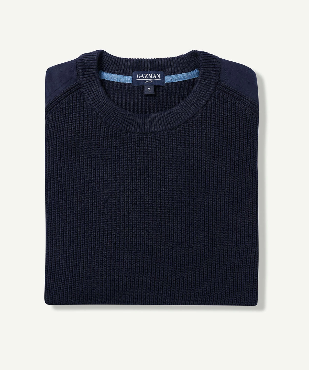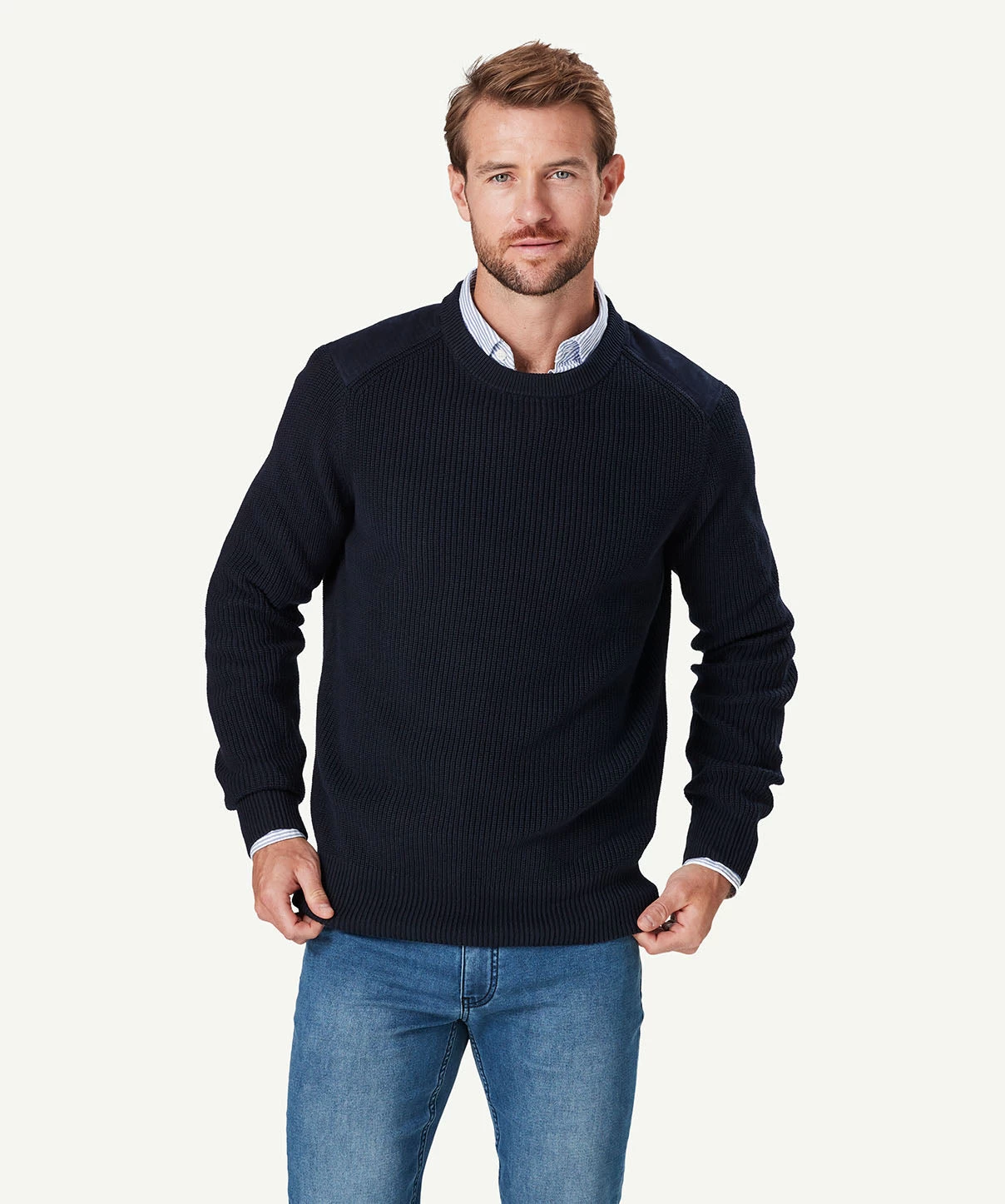 A GAZMAN winter favourite, the Chunky Fishermans Crew is a must have layer for cool weather. The ribbed heavy weight cotton knit features mock suede shoulder trims and crew neck styling. Wear it with a collared shirt or a basic tee for weekend comfort and style. Available in 5 colours.