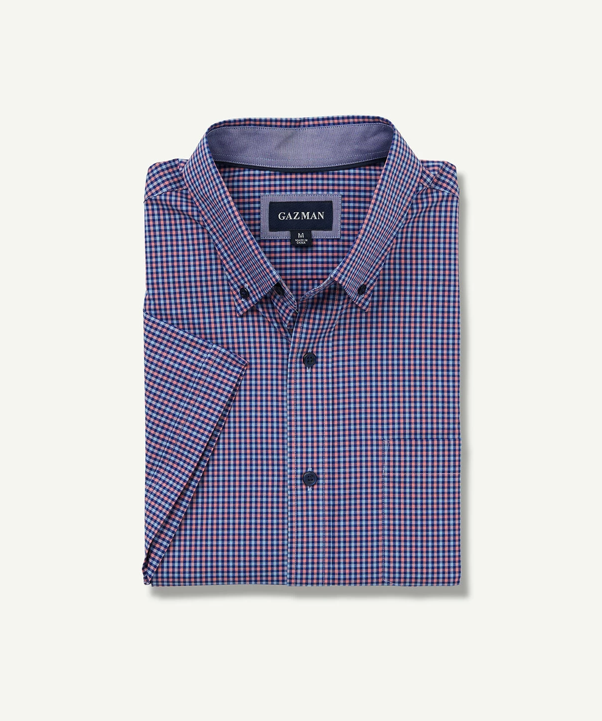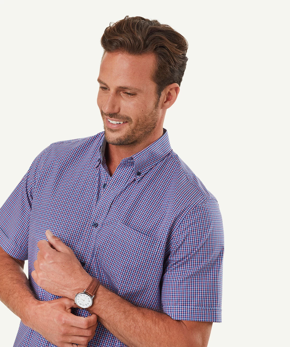 Tones of navy and pink add freshness to this classic gingham shirt. Finished with easy care technology, this short sleeve shirt is easy to iron and comfortable to wear all day long. Pair it together with navy shorts for a relaxed weekend look.