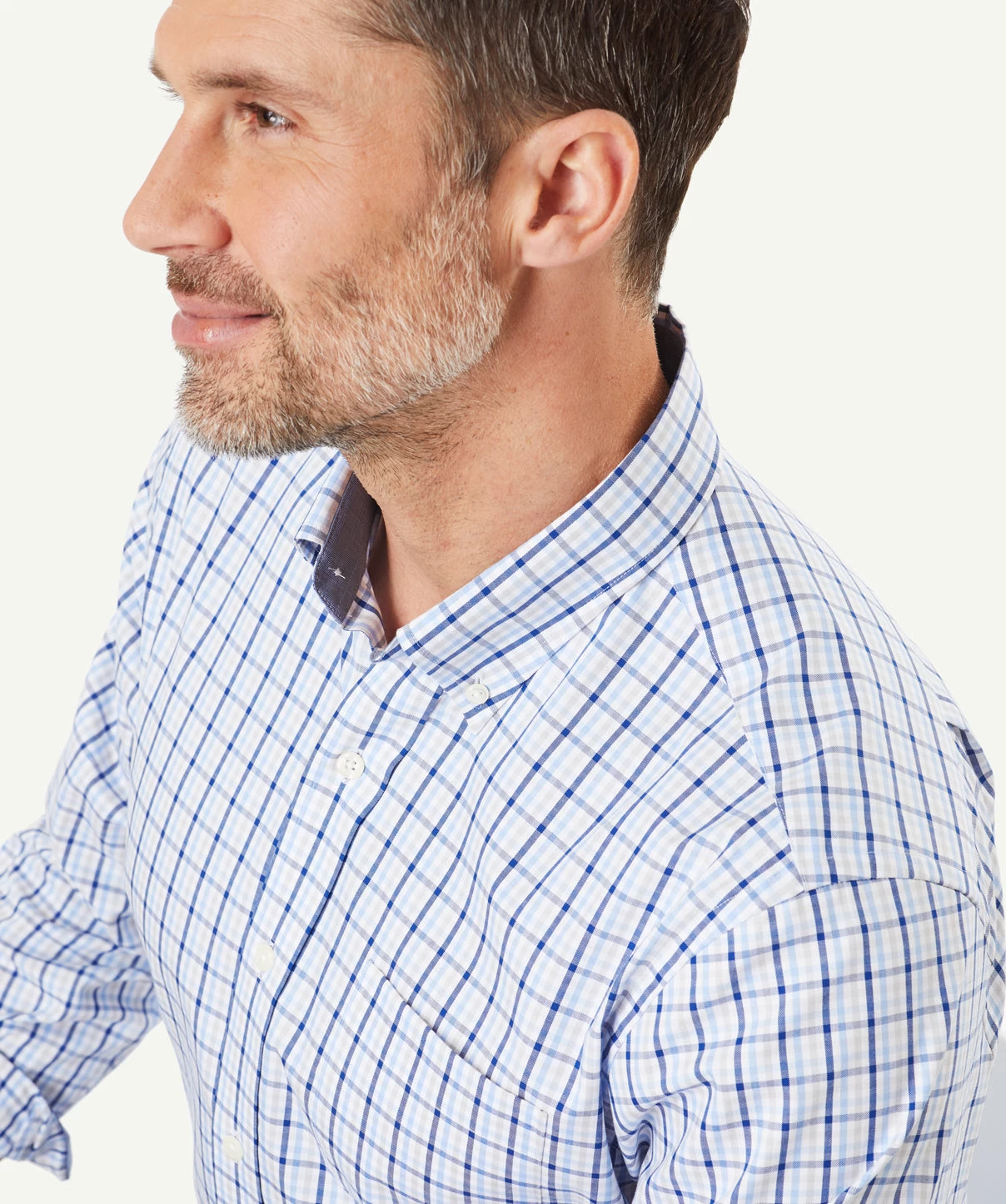Our easy care shirts come with a premium finish so you can enjoy wearing 100% cotton without the fuss. With a low crease finish and easy to iron, this blue and white check shirt is sure to become your new favourite.