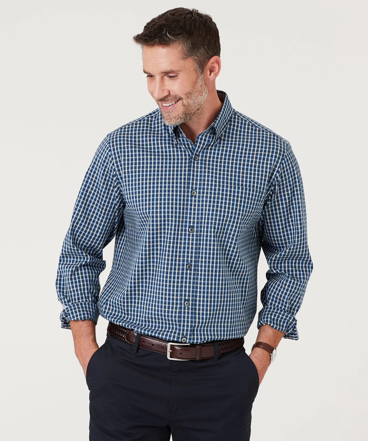 Shades of taupe, navy and bright blue make this easy care shirt ideal for wearing with dark chinos or bedford cords. Match it with dark brown leather accessories for a smart and stylish outfit.