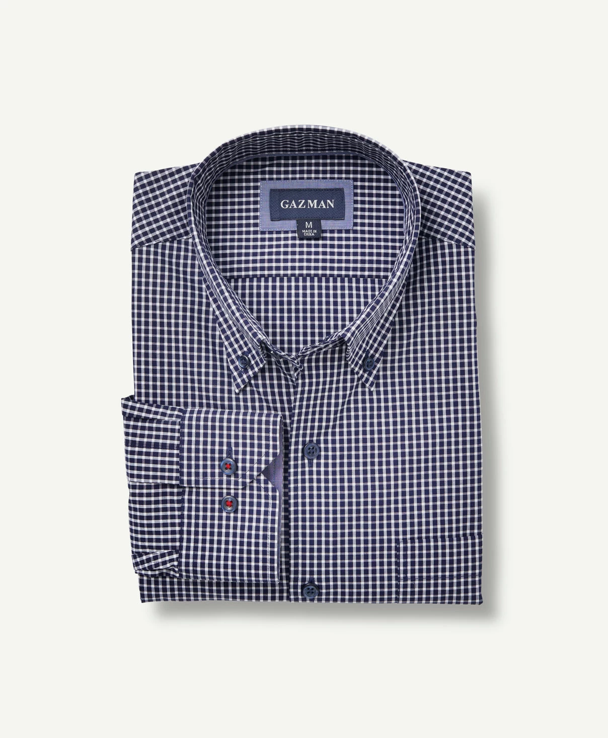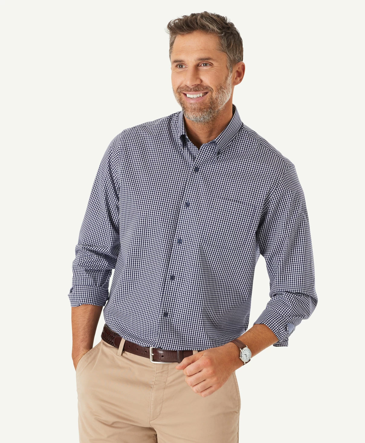An update for your spring wardrobe, this navy and white check shirt stands out from the crowd thanks to its navy buttons and contrast cuff lining. Wear it together with light chinos and tan leather accessories for a fresh spring look.