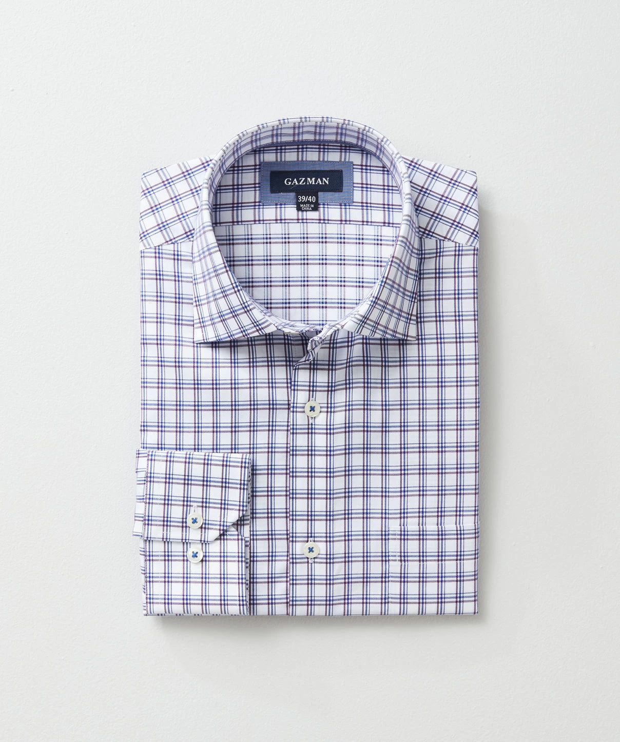 An easy option for the office, our check business shirt features a burgundy and blue check on a white base. Wear it together with navy or charcoal pants and a pair of fun socks.