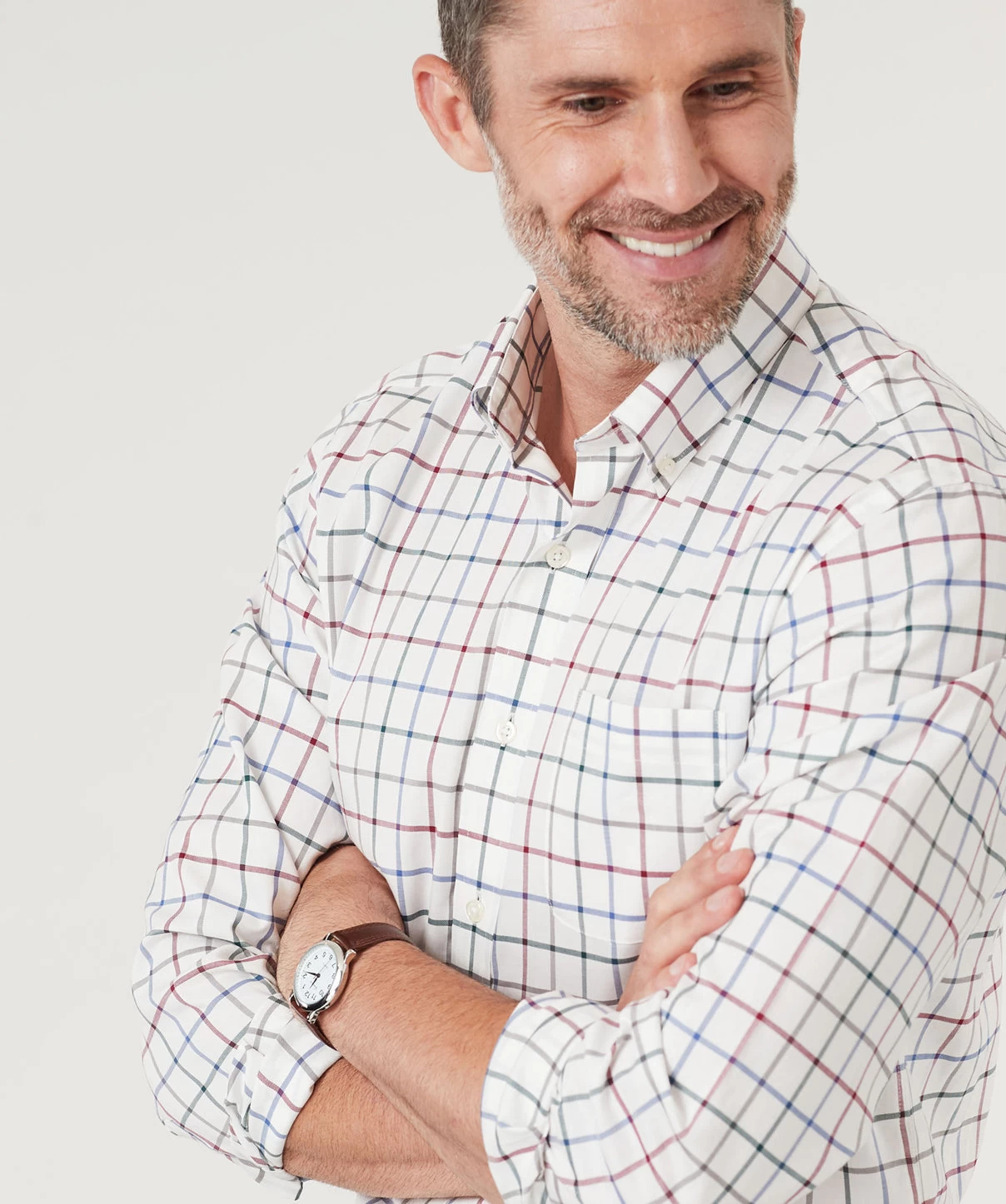A white base brings out the fresh maroon and blue checks of this cotton shirt. Finished with easy care technology, this shirt is comfortable and stays looking crease free for longer.