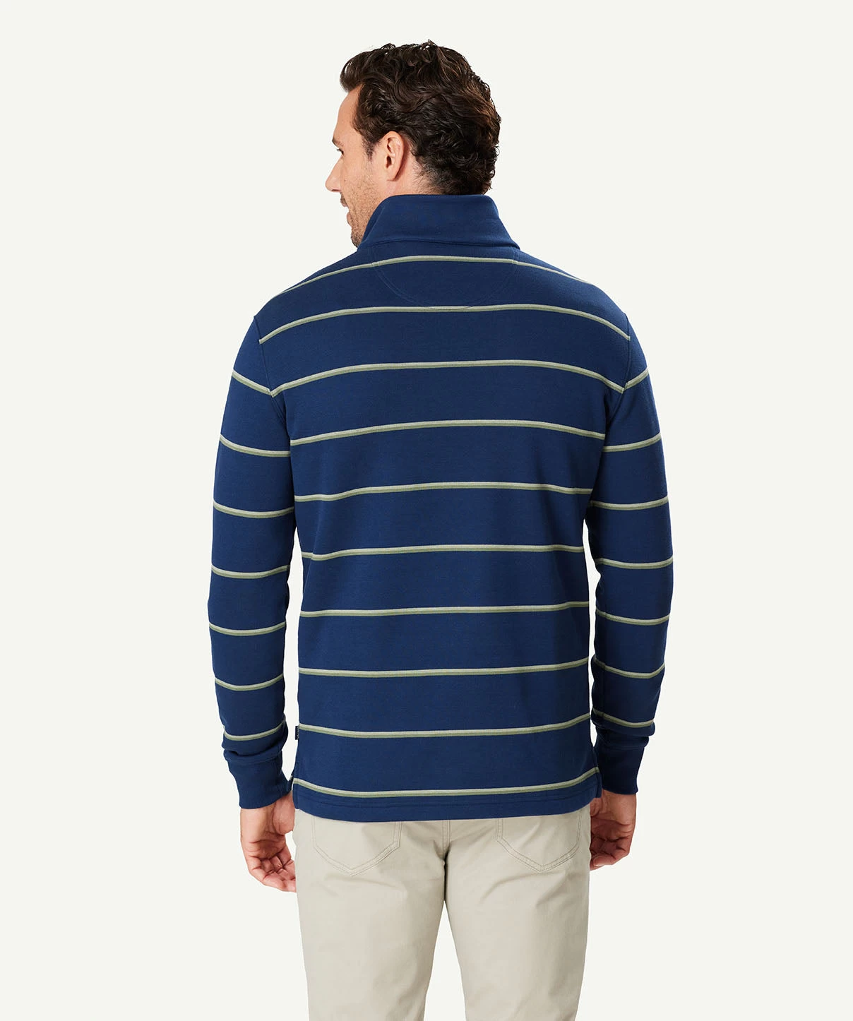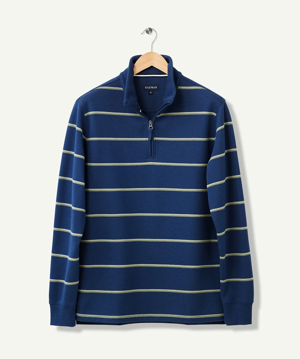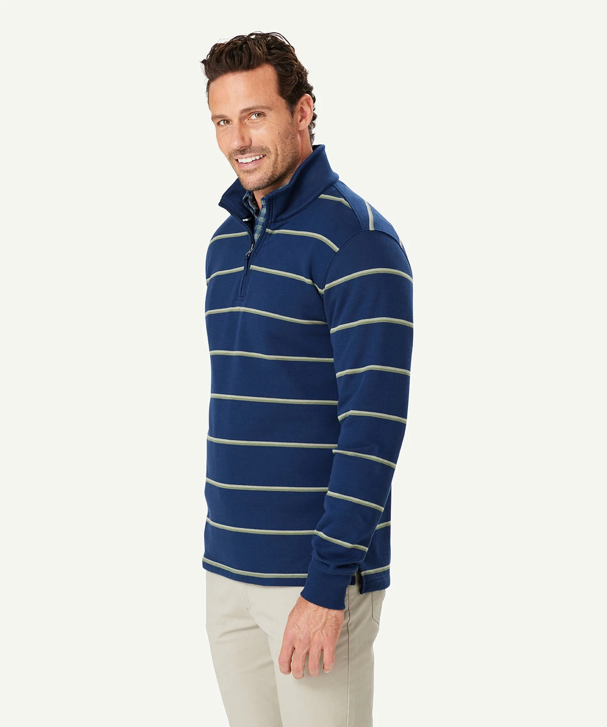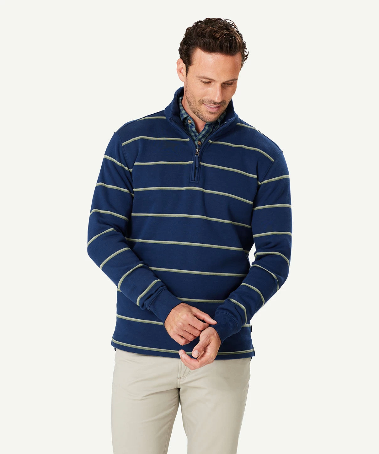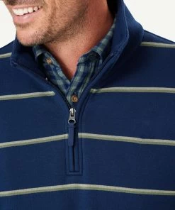 Our Half Zip Fleece Sweat is constructed from soft cotton blend giving it a soft hand feel and making it one of our most comfortable sweats. The classic yarn dyed stripe sweat features half zip styling and ribbed cuffs. A practical men’s sweat that can be worn on your morning walks or layered with a shirt as a more casual outfitting option to a knitwear garment.