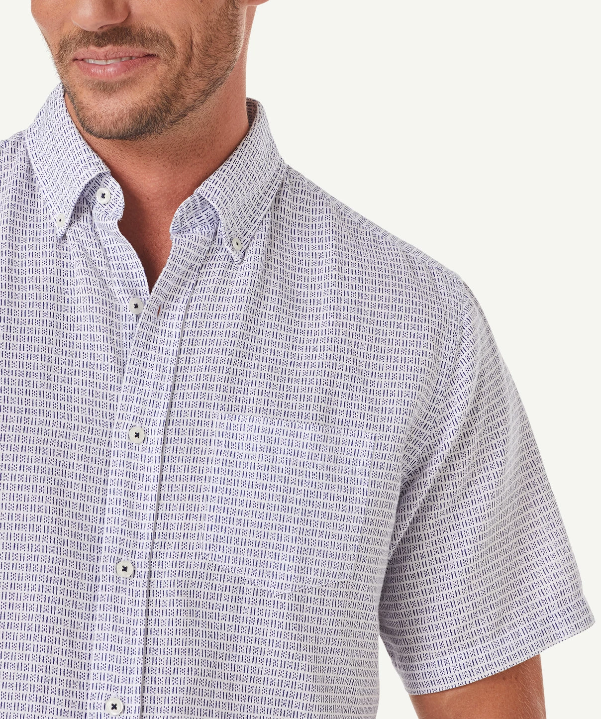 Nothing is quite as cool and comfortable on a hot day than a linen and cotton blend shirt. Featuring a navy dash print, this short sleeve shirt is easy to wear with just about everything in your wardrobe.