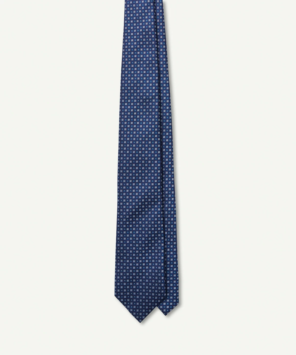 Constructed from silk The Silk Geo Floral Tie features a blue, navy and grey floral pattern that wears well with a tailored white shirt.