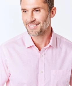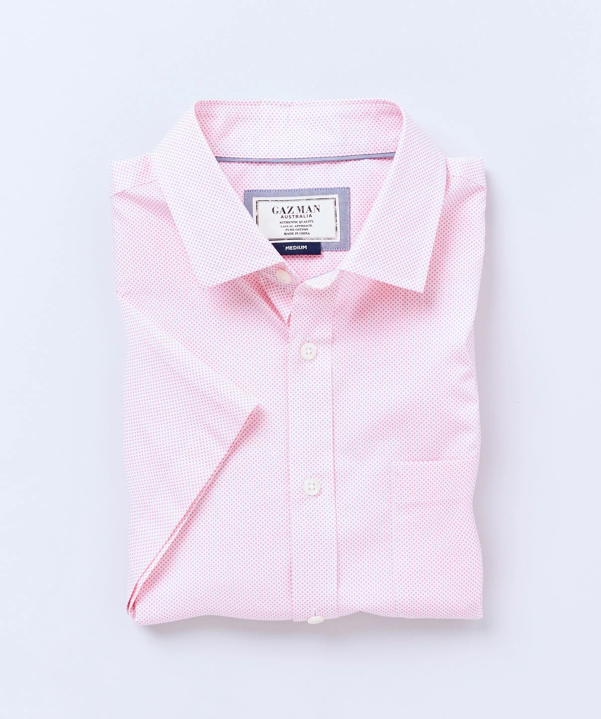 Master your laid back weekend style with this pink and white print shirt. Made from pure cotton, this short sleeve men’s shirt features a single chest pocket and a handsome spread collar.