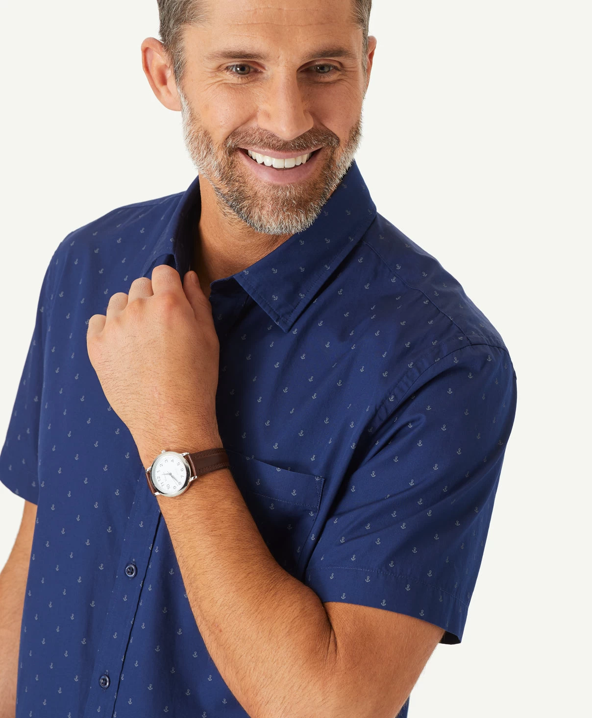 Have some fun this summer in our anchor print shirt. Featuring a white anchor print on a navy cotton background, this short sleeve shirt is perfect for weekends.