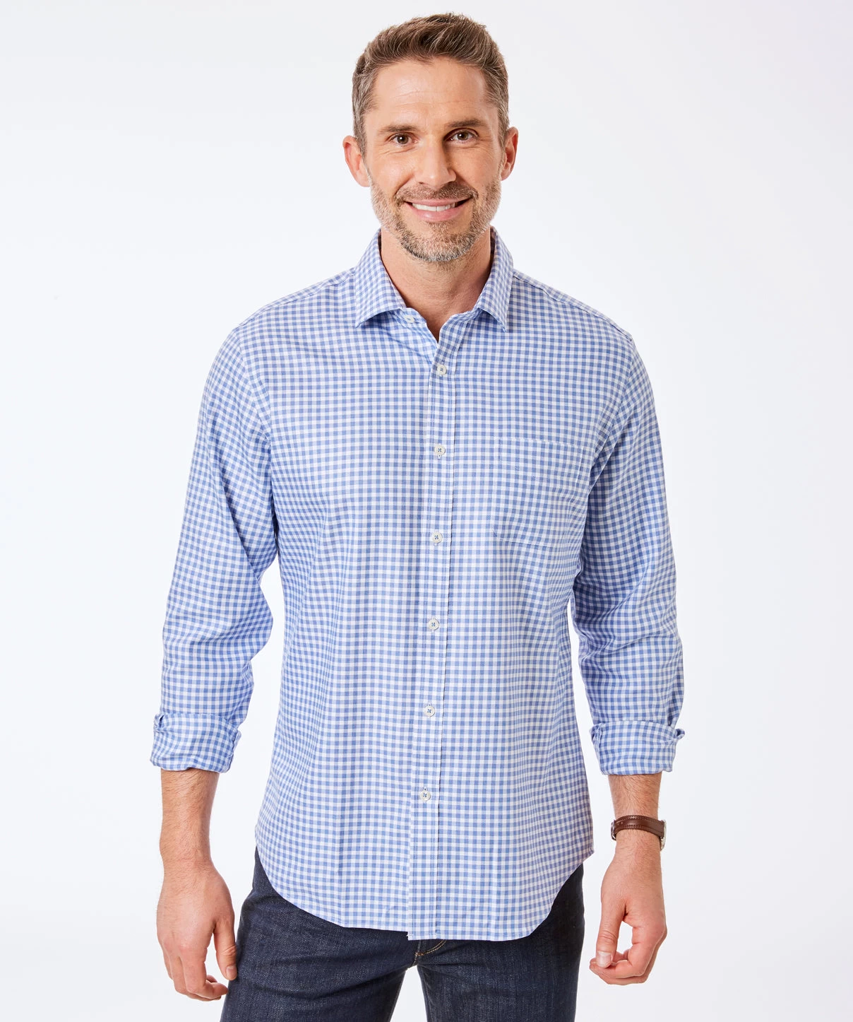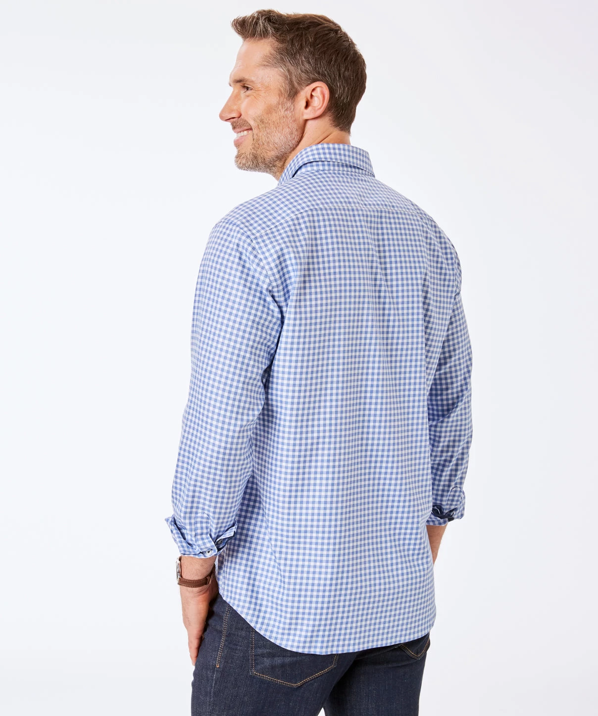 Our men’s easy care dobby check shirt looks good in any situation. Look sharp for a day in the office, then roll up the sleeves for after work drinks.