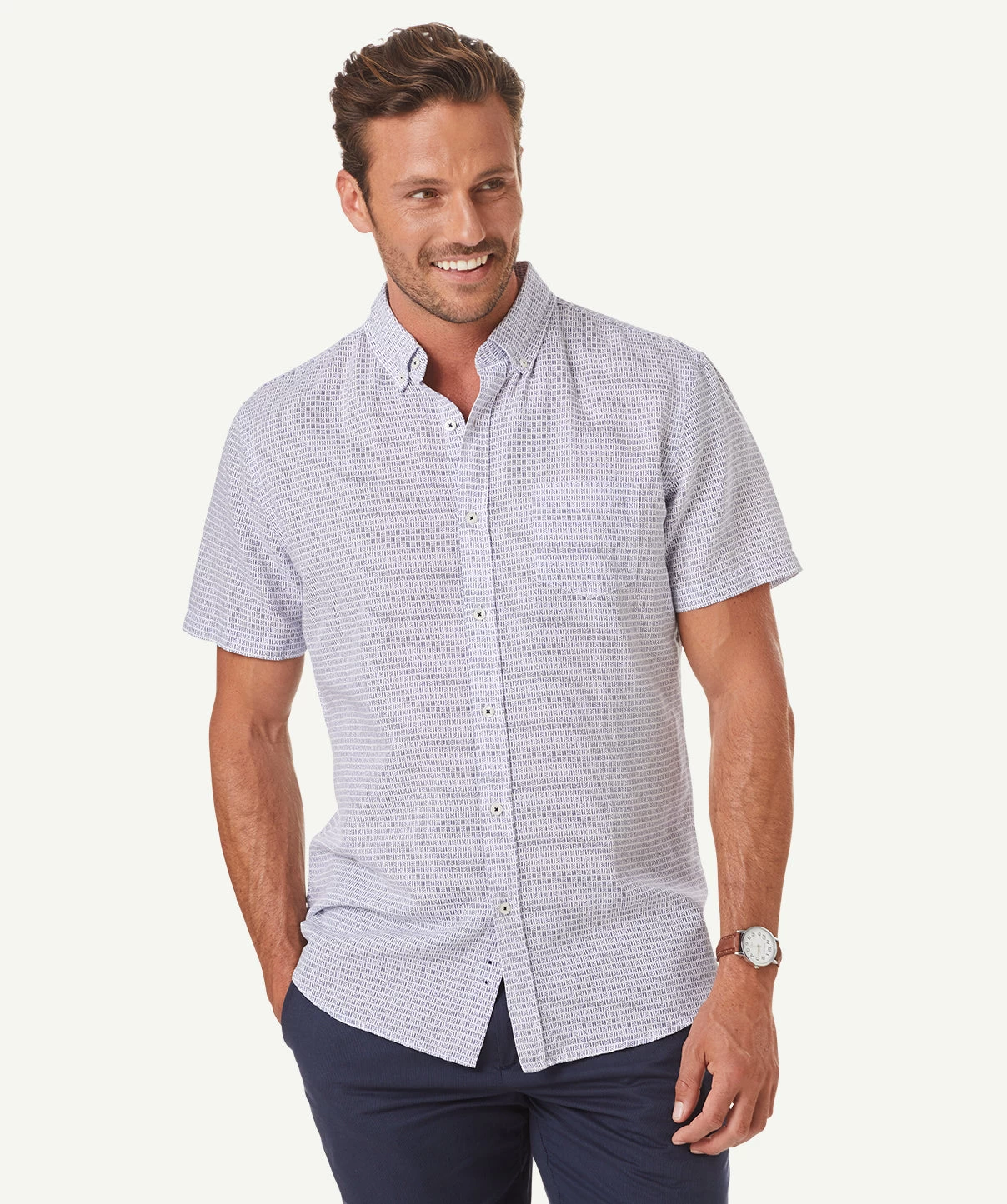 Nothing is quite as cool and comfortable on a hot day than a linen and cotton blend shirt. Featuring a navy dash print, this short sleeve shirt is easy to wear with just about everything in your wardrobe.