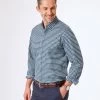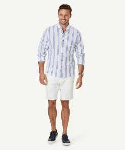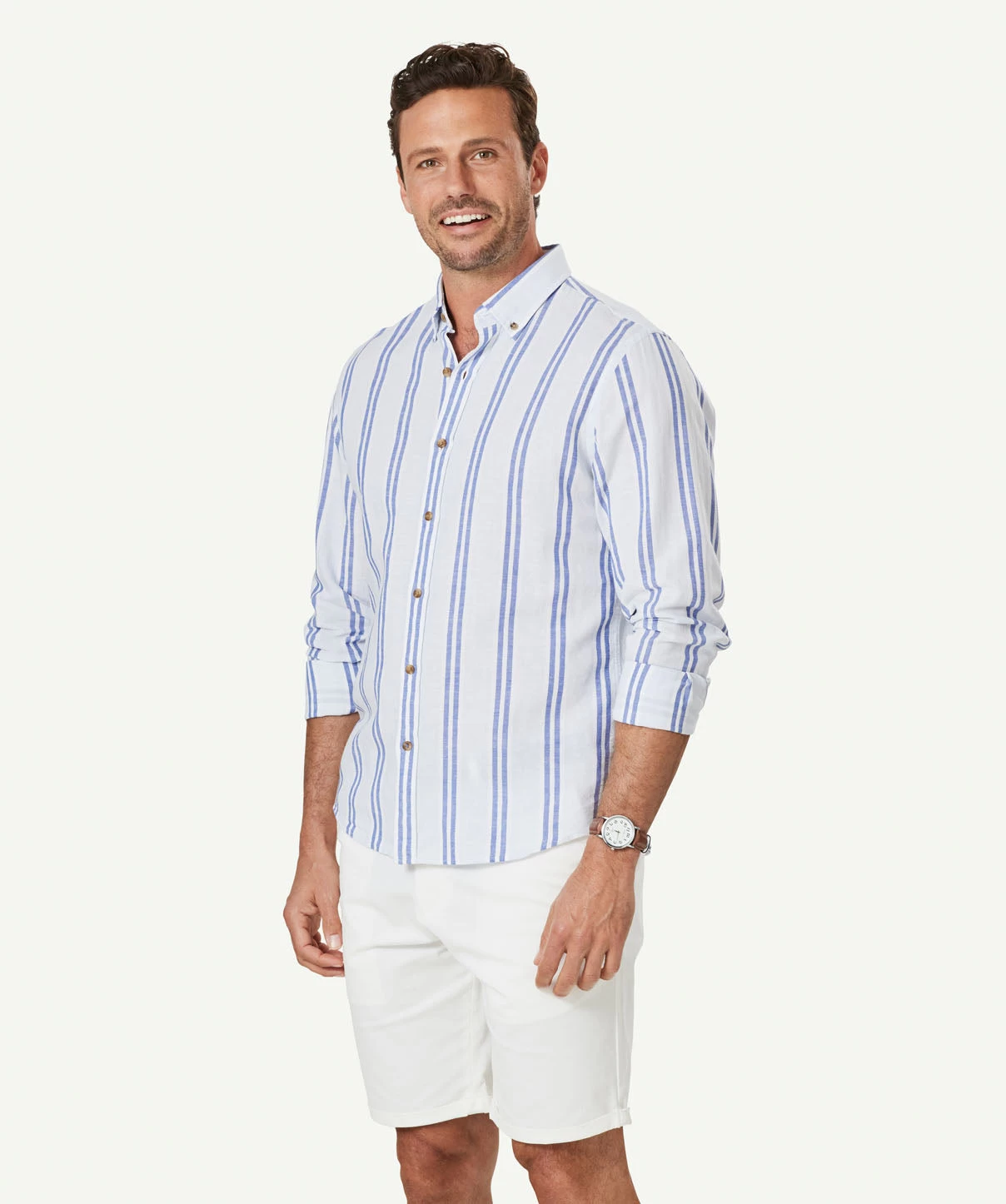 Refined style, our Tailored Linen Blend Stripe Shirt is light weight, breathable and an easy option for any GAZMAN outfit. The shirt is constructed in a regular fit for a relaxed style with a pleat on the back for ease of movement. Available in an easy to style pale blue that pairs well with tan chinos or shorts.