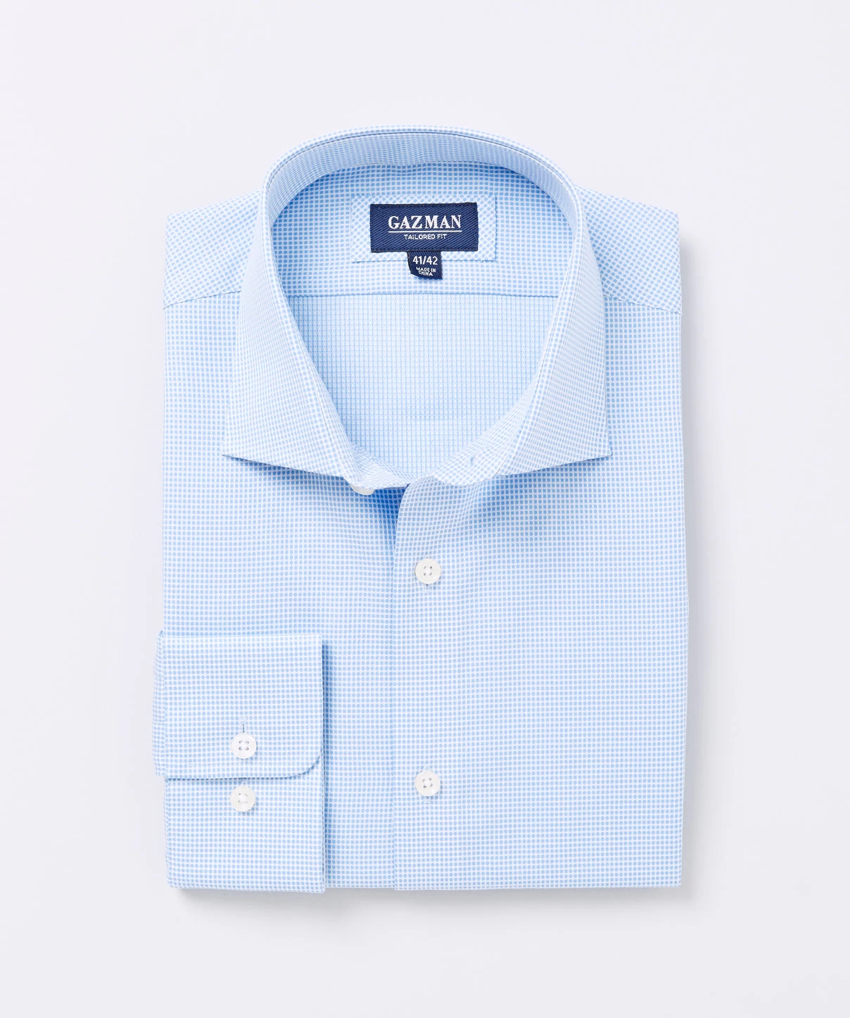 Our modern geo design shirt is somewhere between a dot print and a fine check. Featuring blue geometric dots on a white background, this handsome shirt is easy to match with a range of ties and pants.